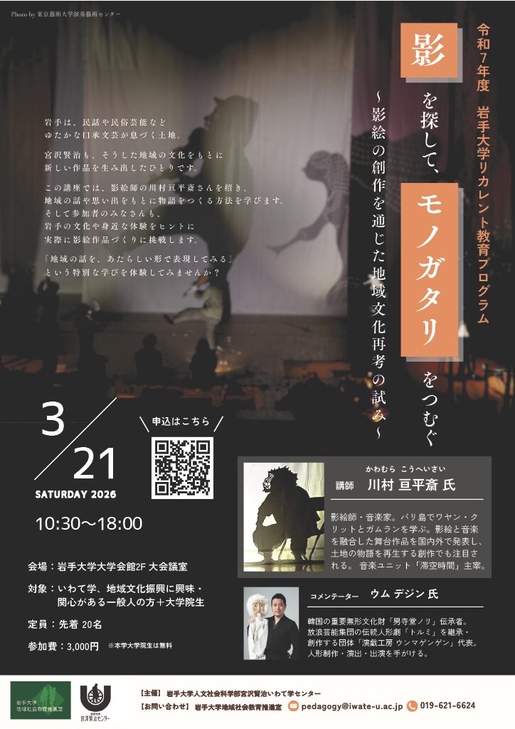令和7年度岩手大学リカレント教育プログラム「影を探して、モノガタリをつむぐ~影絵の創作を通じた地域文化再考の試み~」のご案内(岩手大学人文社会科学部宮沢賢治いわて学センター)