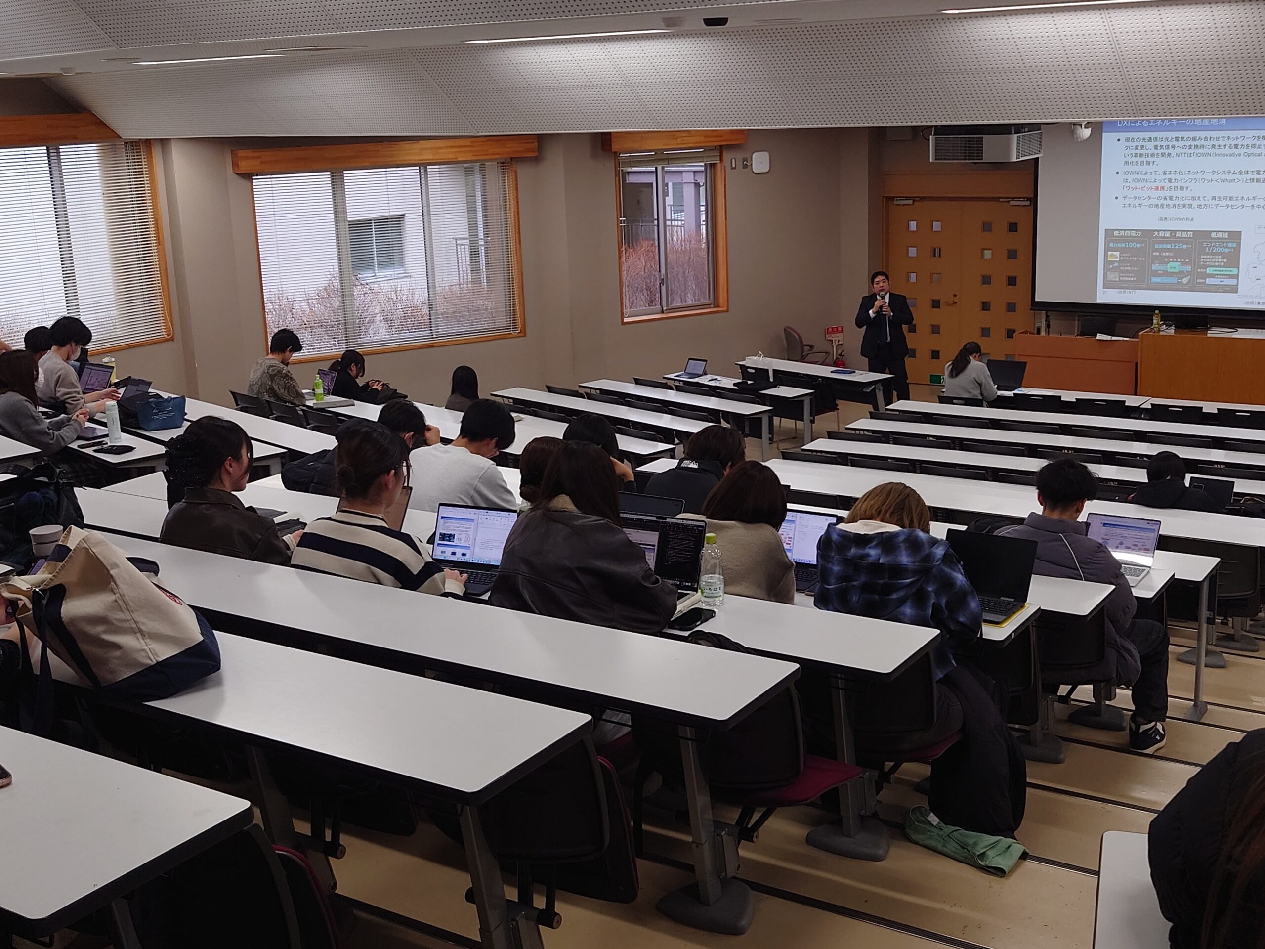 受講した学生からは、「GXは単なる環境対策ではなく、技術覇権や経済成長の戦略的要素を含むことに気づけた」「GX産業による「地域活性化」を期待している」など、最新動向を踏まえた講義に熱心に耳を傾けていました。