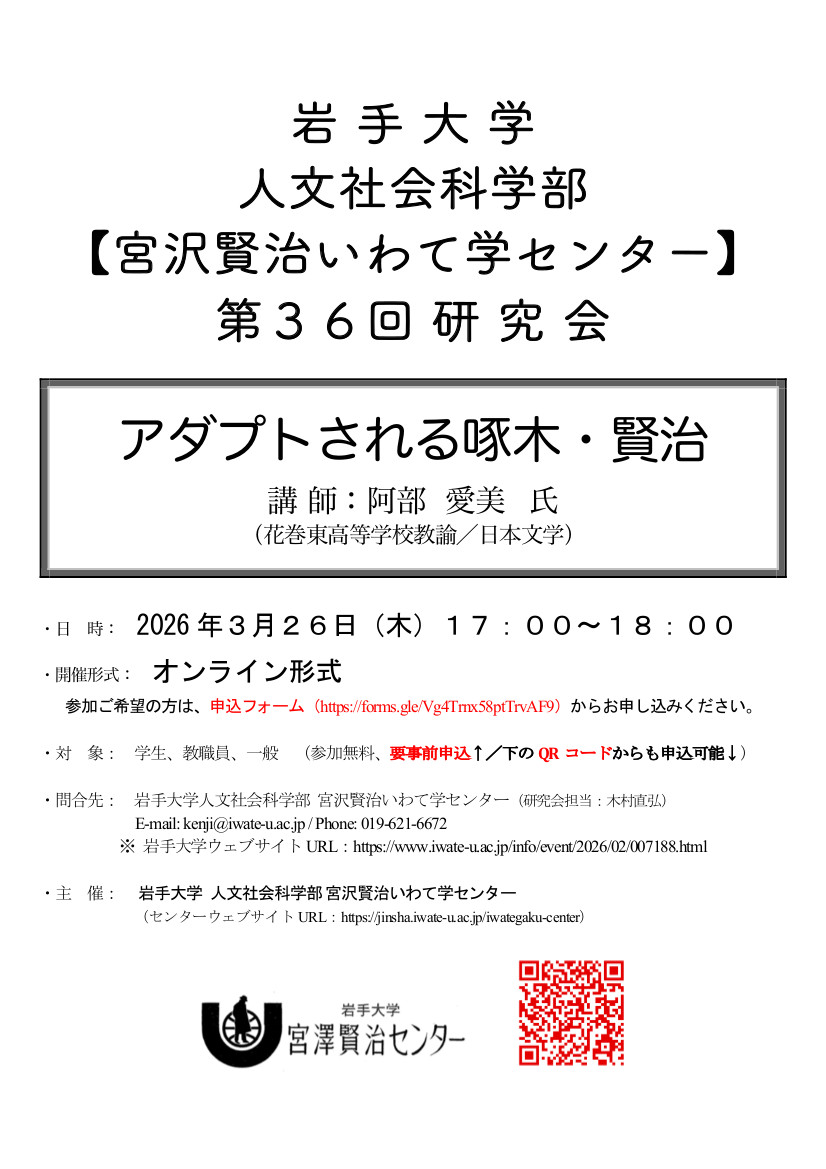 名 称: 岩手大学人文社会科学部 宮沢賢治いわて学センター 第36回研究会